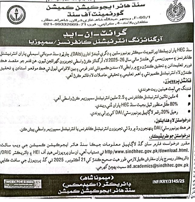 The Sindh Higher Education commission (SHEC) is committed to enhancing the academic and research landscape by providing financial assistance to both public and private sector universities, as well as Degree Awarding Institutes (DAIs), for organizing international conferences and symposia. This initiative is part of the broader vision to promote scholarly collaboration, elevate the standard of education, and encourage cross-border knowledge exchange in Sindh.