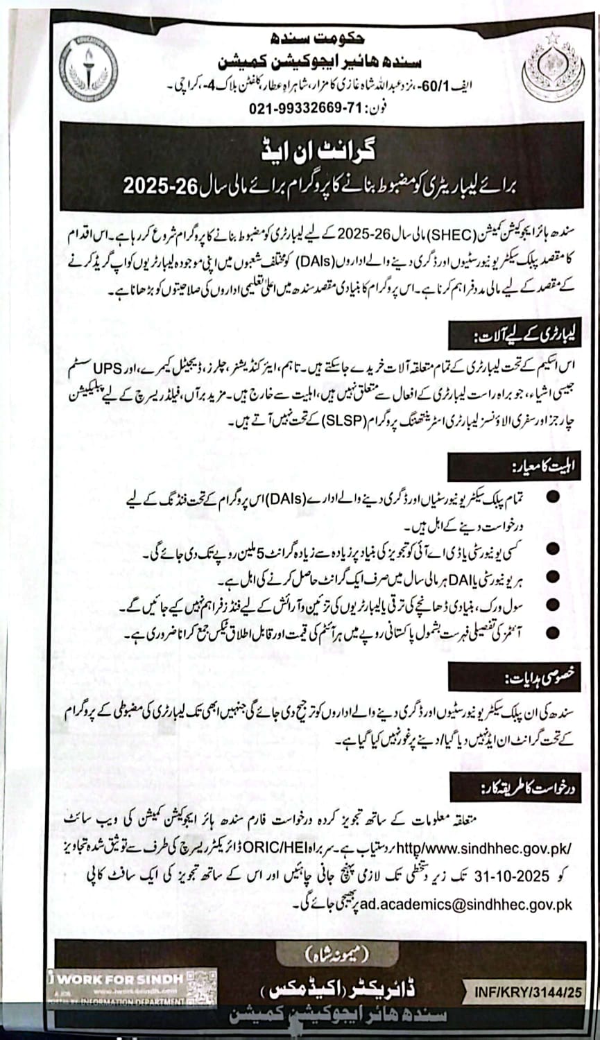Science and technology are fundamental pillars in the development of a robust higher education infrastructure, fostering innovation, research and academic excellence. However, many institutions in Sindh face challenges in building the required institutional capacity to actively engage in substantial research and development activities. Recognizing this gap, the Sindh higher Education Commission (SHEC) has launched a comprehensive initiative aimed at enhancing the research environment within public sector universities across Sindh.